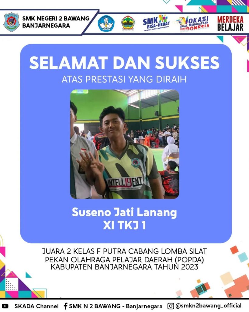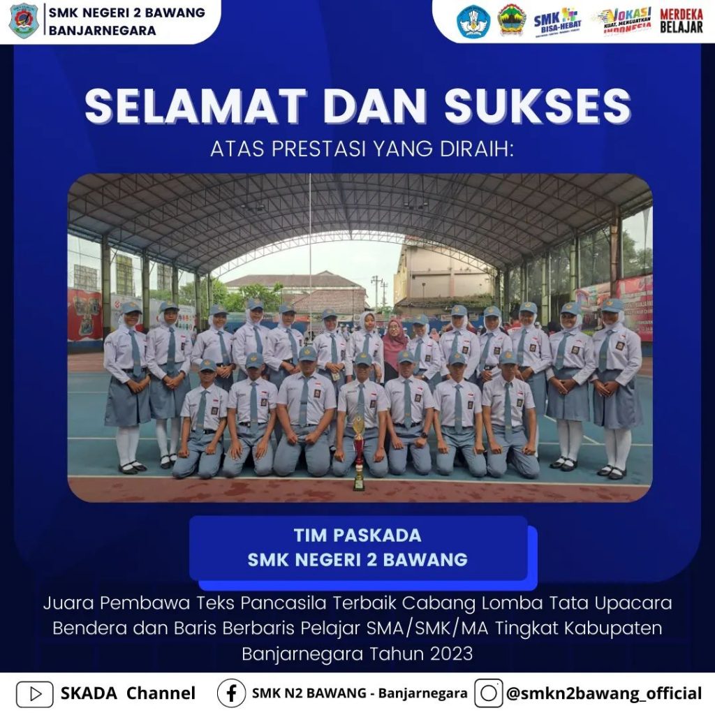 Selamat kepada Tim Paskada SMK Negeri 2 Bawang 1. Pembawa Teks Pancasila Terbaik atas nama Kukuh Lutfian Maulana XI TBSM 3 yang telah berhasil memperoleh Kejuaraan Cabang Lomba Tata Upacara Bendera dan Baris Berbaris Pelajar SMA/SMK/MA Tingkat Kabupaten Banjarnegara Tahun Read More …
