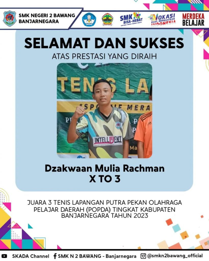 Selamat kepada DZAKWAAN MULIA RACHMAN yang telah berhasil memperoleh Juara 3 Cabang Lomba Tenis Lapangan Putra pada Pekan Olahraga Pelajar Daerah (POPDA) Tingkat Kabupaten Banjarnegara 2023.