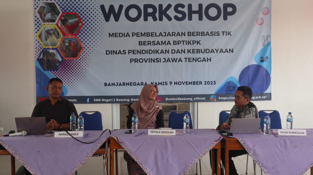 Kamis, 09 November 2023 bertempat di Bengkel TITL SMKN 2 Bawang Mengadakan Pelatihan untuk guru & karyawan SMK N 2 Bawang dengan Tema “MEDIA PEMBELAJARAN BERBASIS TIK” yang dipandu oleh Beliau Bpk. M. Heru Kusumo, S.Kom. Narasumber dari BPTIKDIKBUD JATENG Bersama tim.